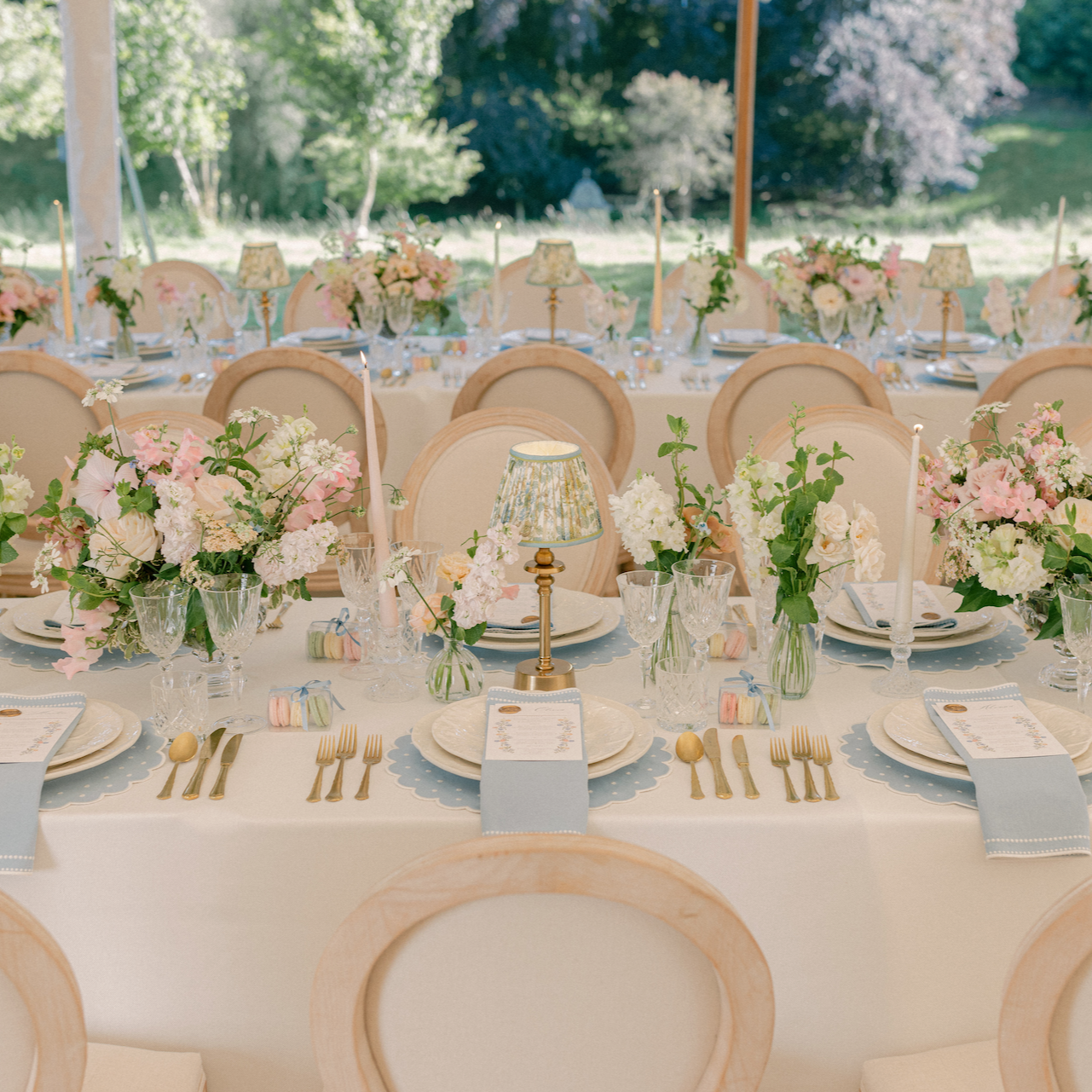 Dress your table with this stylish and elegant pale blue placemat with a white embroidered trim and dots. Matching napkin also available.