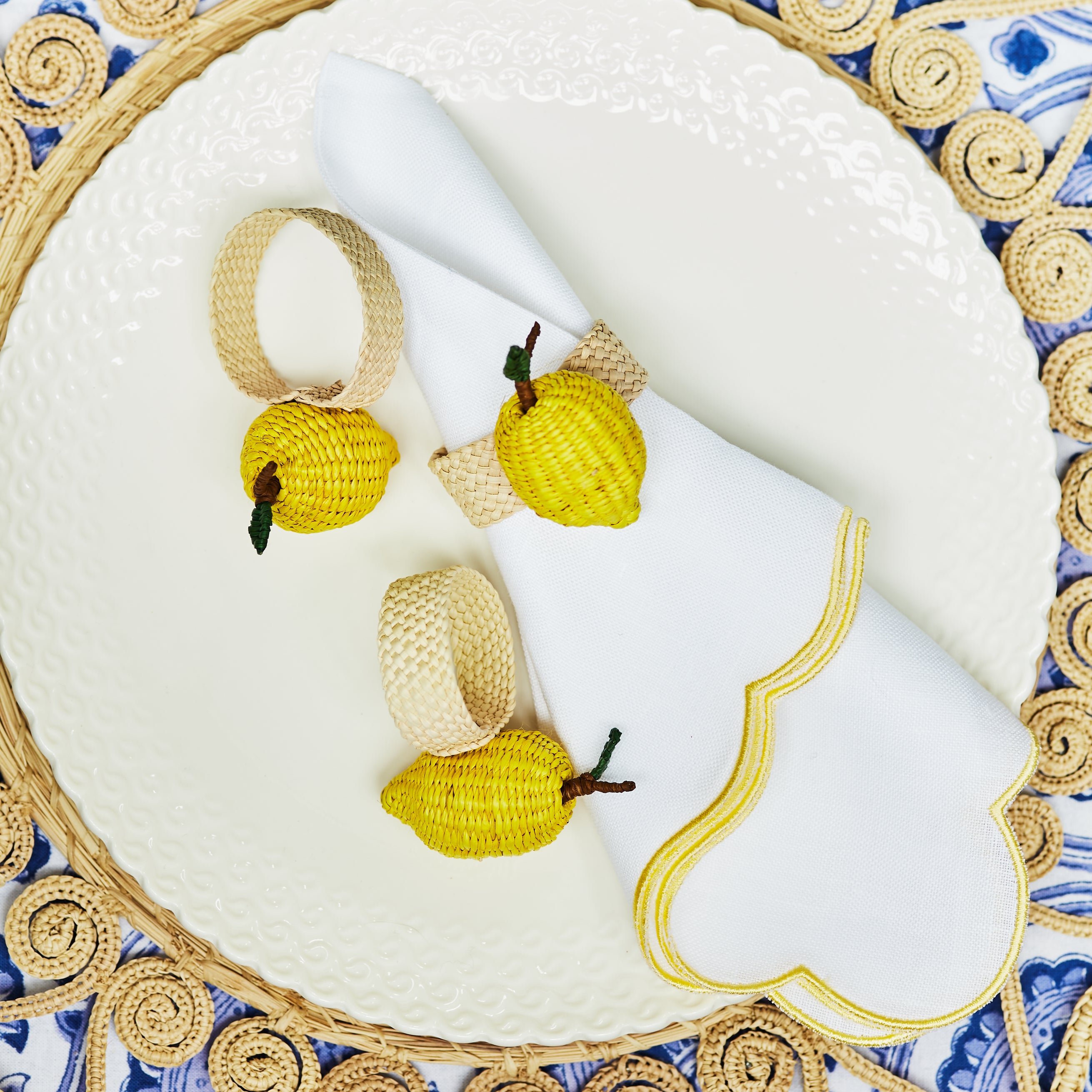 Simple white cotton/linen mix napkin with a delicate yellow embroidered scallop edge.