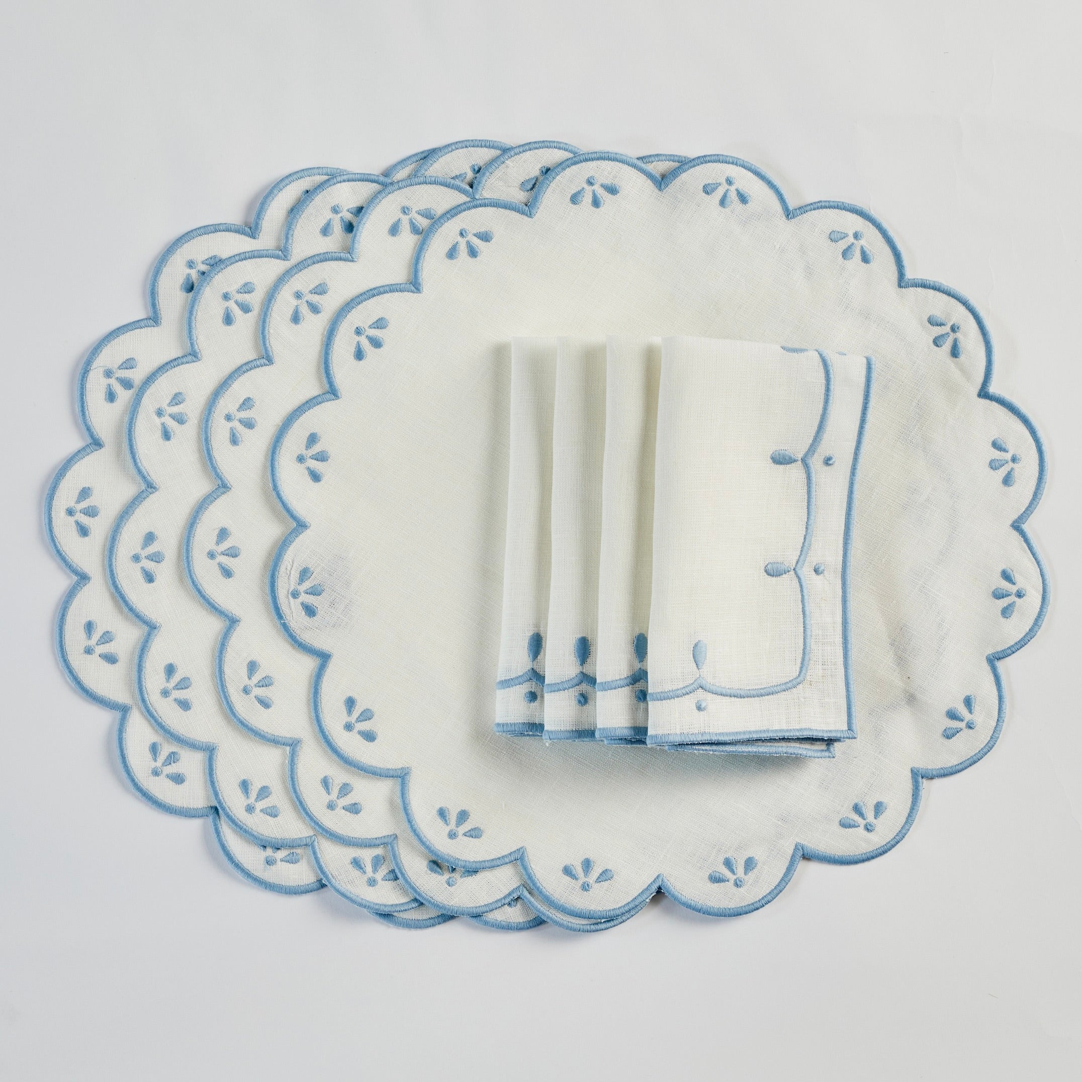 The delicately hand embroidered garland and teardrops create an elegant scallop design that is the perfect backdrop to enhance any dining experience.