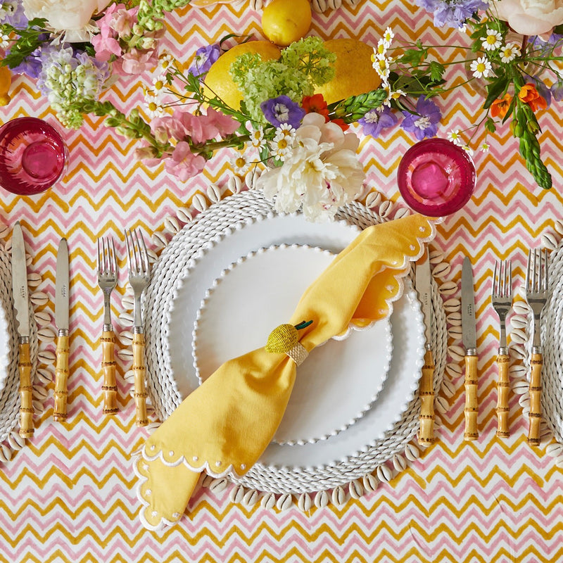 This colourful yellow and pink Capri Tablecloth is hand block printed using the finest cotton. Taking inspiration from the Italian island this table will take you straight back evenings at Da Paolino.