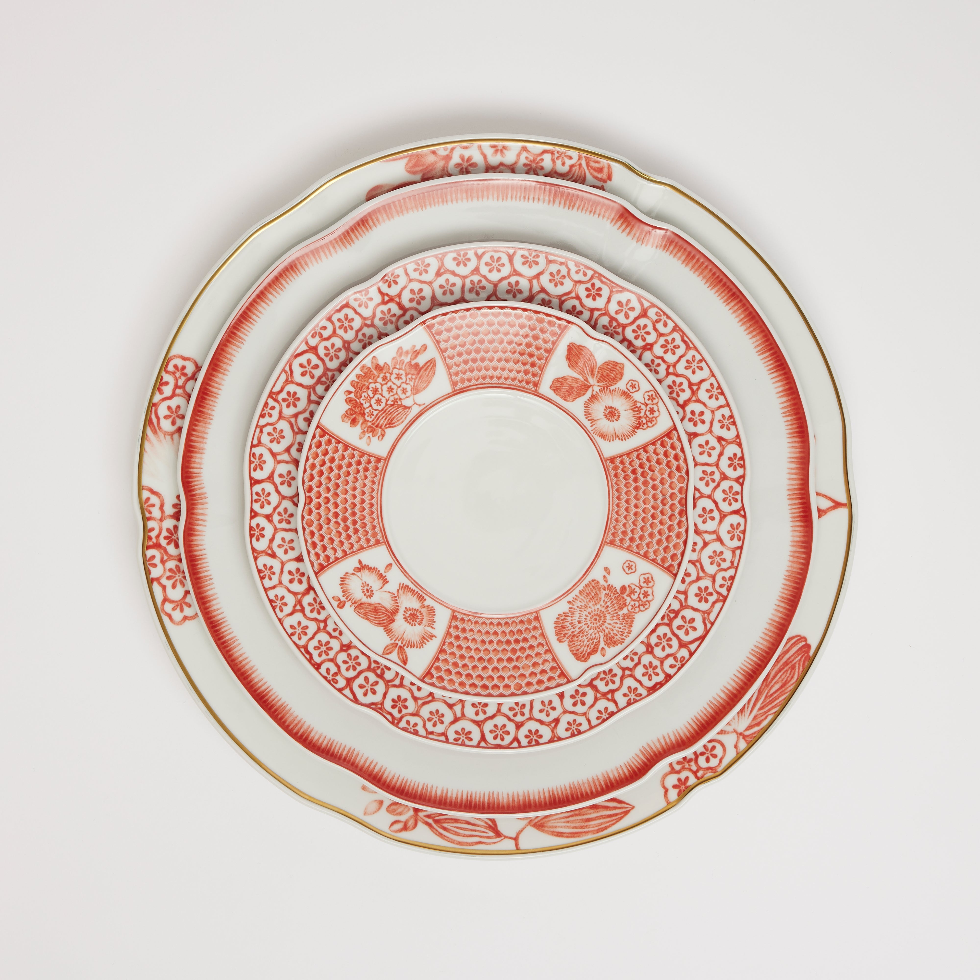 Set includes charger, dinner plate, dessert plate and bread plate.